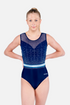 Introducing Twilight, a navy lycra gymnastics leotard with a mesh overlay on a sweetheart neckline. Elevated by baby blue and silver belt detailing and adorned with beautiful sparkles, this sophisticated design features mesh cross-over straps and a round neck. Shine brightly and perform elegantly with this stunning leotard.