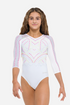 - White lined lycra body and 3/4 sleeves with mesh panel down the centre of the sleeves