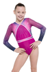 Ophelia Long Sleeve girl's gymnastics leotard keeps the signature sparkle and style of the short sleeve version in a long sleeve design. The blackberry lycra body is nude lined for comfort, while the sublimated mesh waistband with bubblegum mystique adds shimmer. Sleeves in sublimated navy, marshmallow, blackberry, and bubblegum create a soft, playful ombre effect. Keyholes under the V-neck front and at the back below the clasp add movement and shape. Bubblegum binding and appliqué across the bodice and waist tie the look together, while standard, AB, and boat stones fan out in bursts for maximum sparkle.