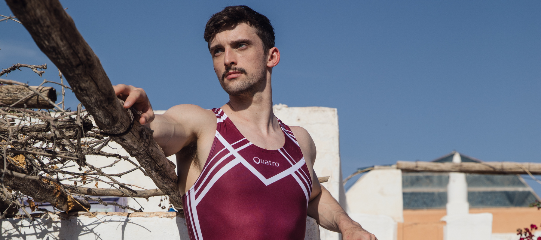 The Drive men’s leotard blends sleek functionality with athletic style. Designed in lightweight sublimated lycra, it features a bold burgundy and white colour palette, enhanced by a modern wraparound pattern. The racerback cut and boxer style ensure no bunching and maximum comfort, ideal for intense training or competition. Subtle mesh panels at the back provide breathability, while the clean design showcases Quatro’s signature craftsmanship.